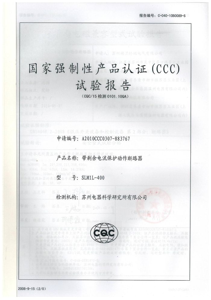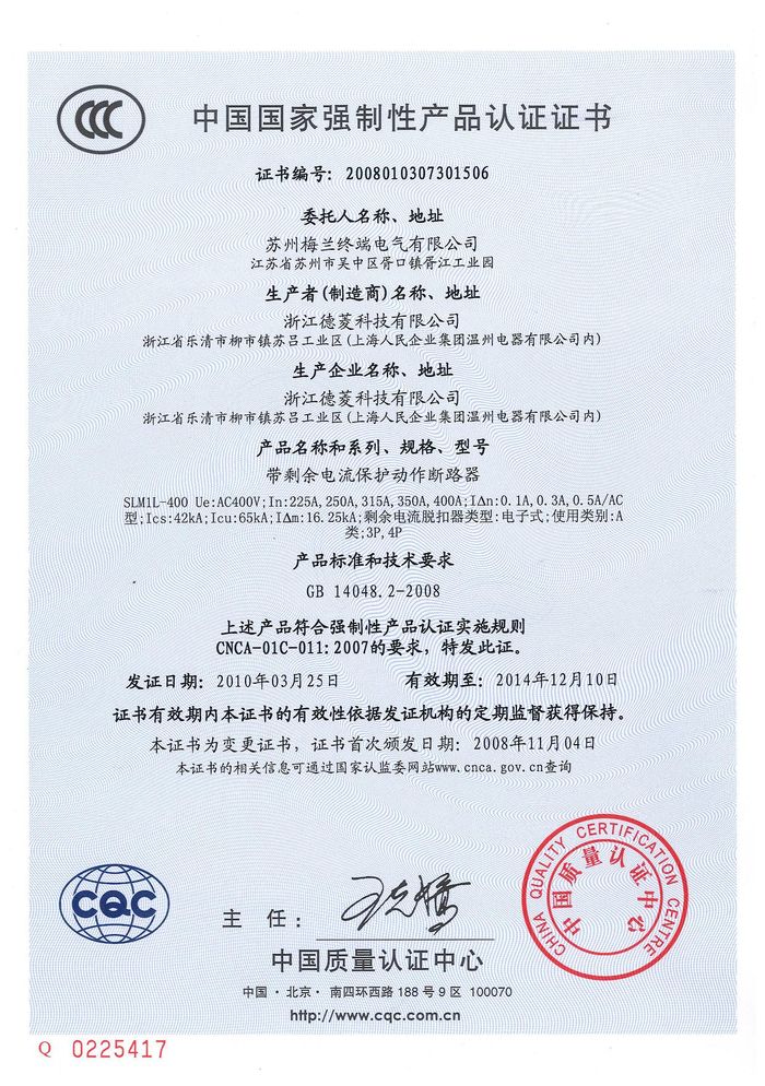 SLM1L-400塑殼斷路器資質(zhì)證書
