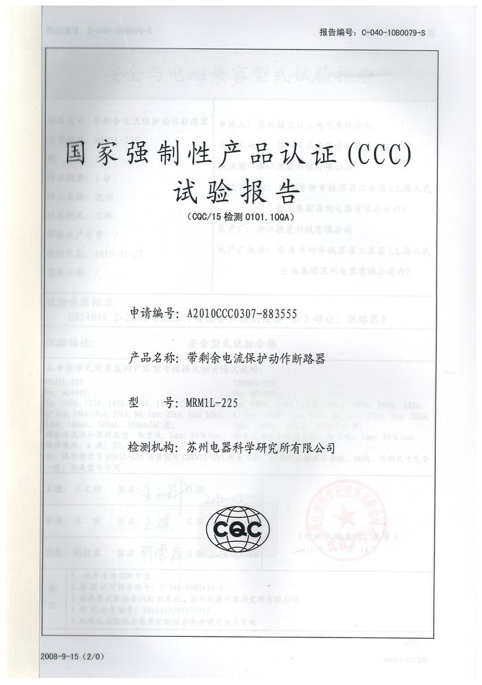 MRM1L-225塑殼漏電資質(zhì)證書