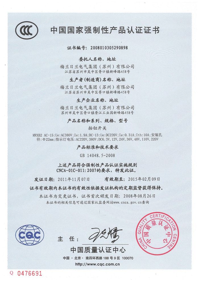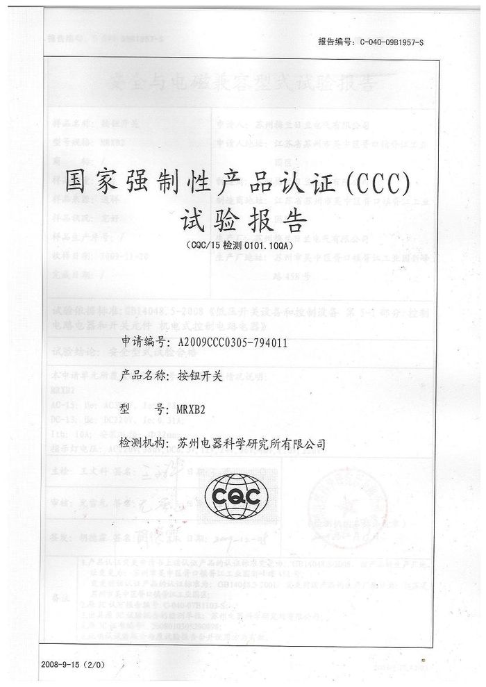MRXB2按鈕開(kāi)關(guān)資質(zhì)證書(shū)
