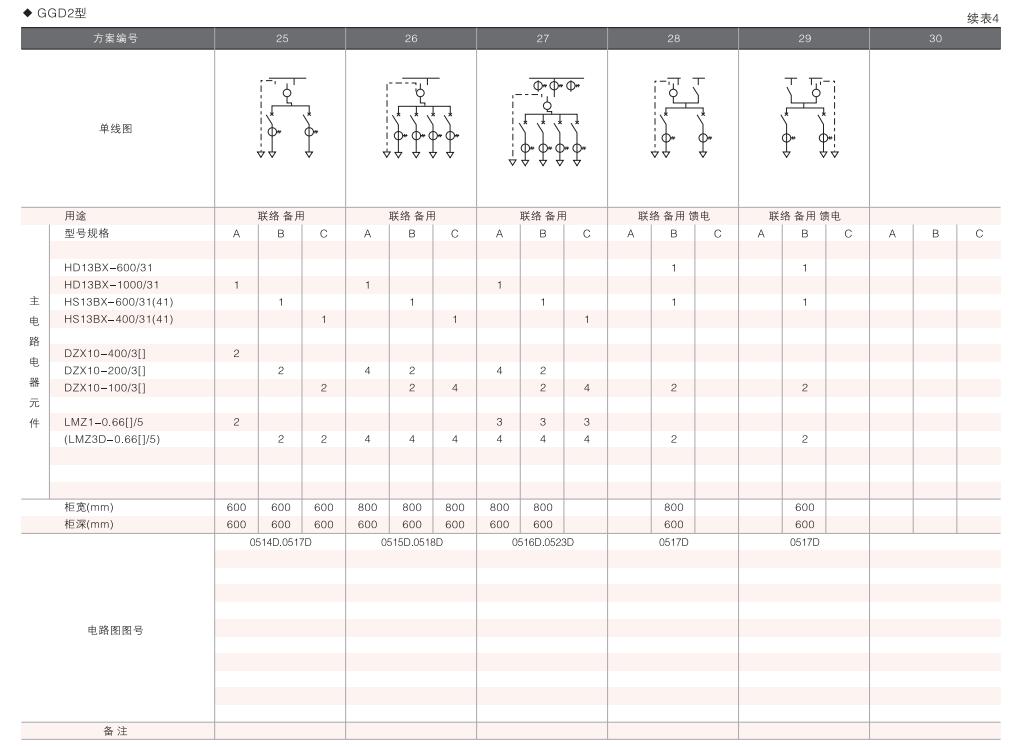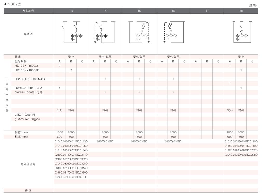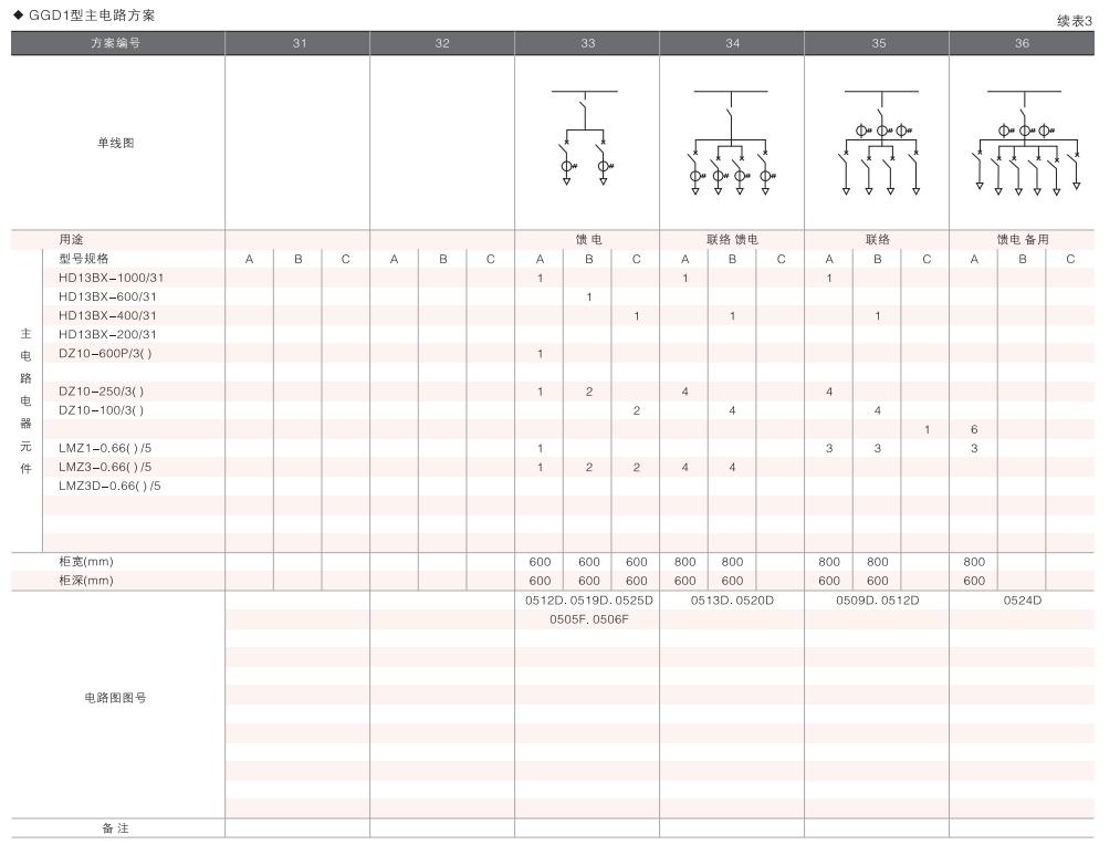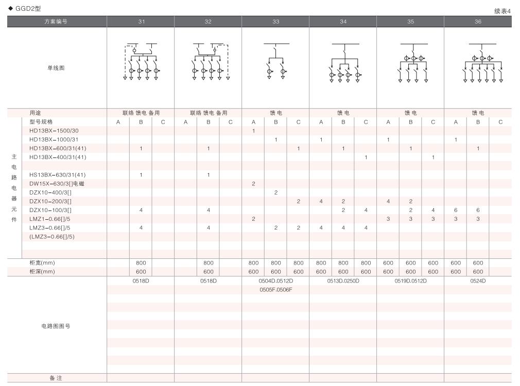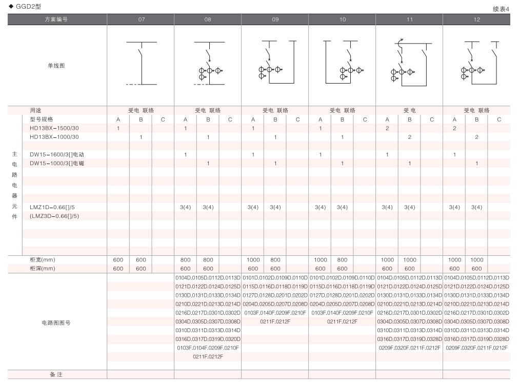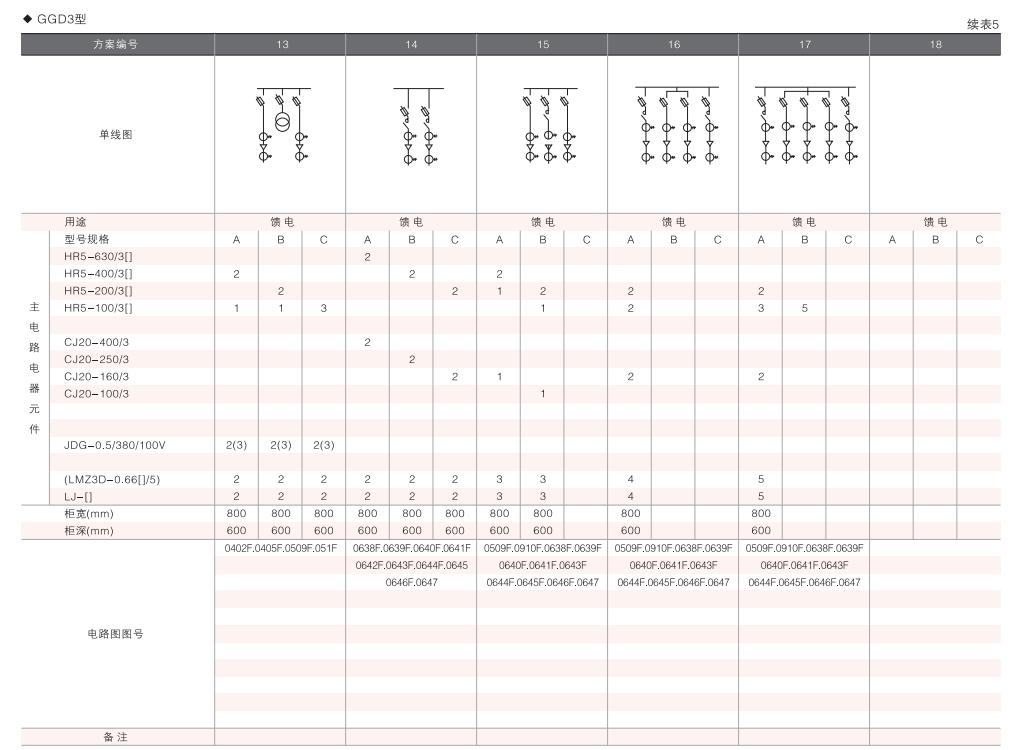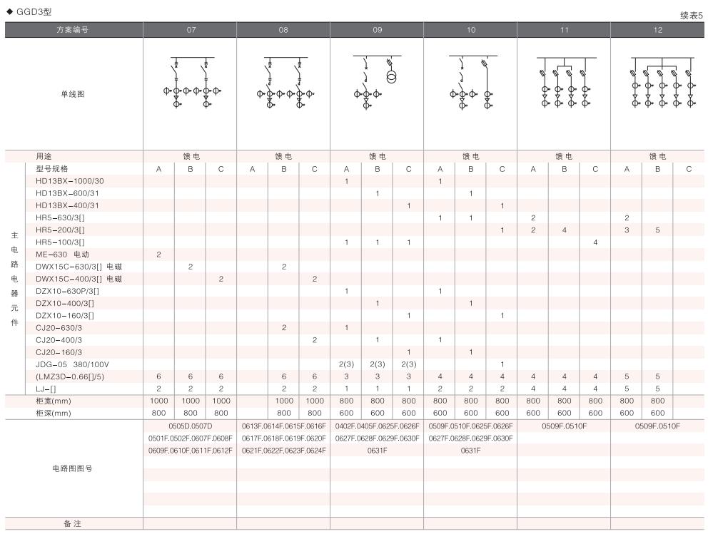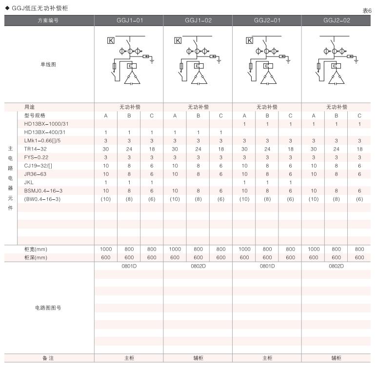 此外,為適應(yīng)無功補償?shù)男枰O(shè)計了GGD電容補償柜,其主電路方案4個,共12個規(guī)格。