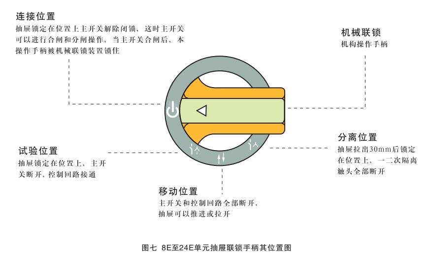 8E/4, 8E/2單元抽屜的操作:這種操作是通過對抽屜面板上的手柄進(jìn)行操作實(shí)現(xiàn)的,見圖六。只有當(dāng)手柄上的白箭頭指示“移動位置”(↑↓)時(shí),抽屜方可抽出或插入,在其它任何位置上,抽屜都應(yīng)被鎖定,因此不可能對抽屜實(shí)施抽出或插入操作。此時(shí)不可硬拉或硬拖以免損壞機(jī)械聯(lián)鎖機(jī)構(gòu),抽屜從連接位置抽出30mm(此時(shí)手中工件一輕微震頗感)時(shí)將操作手柄向逆時(shí)針方向轉(zhuǎn)過45°,抽屜即被鎖定在“分離位置”(↑↓)此時(shí)一次和二次隔離插件均己脫離電網(wǎng)并形成安全間隔。
